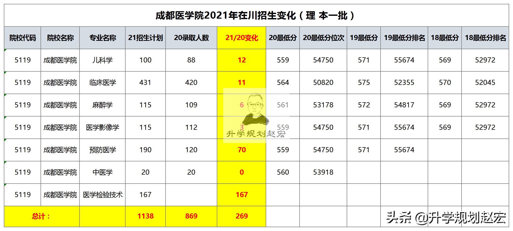 四川医科大学2021年招生计划终于完成,成都中医药大学还没写;西南医科大学、川北医学院招生变化见我主页;再来看看成都医学院20201年在川的招生变化,总共在川招生2632人(本科普通招生批次,不含定向、专科等。),详情见下文比2020年增加240人其中理科本一批增加了269人,增加最多是预防医学70人;.
