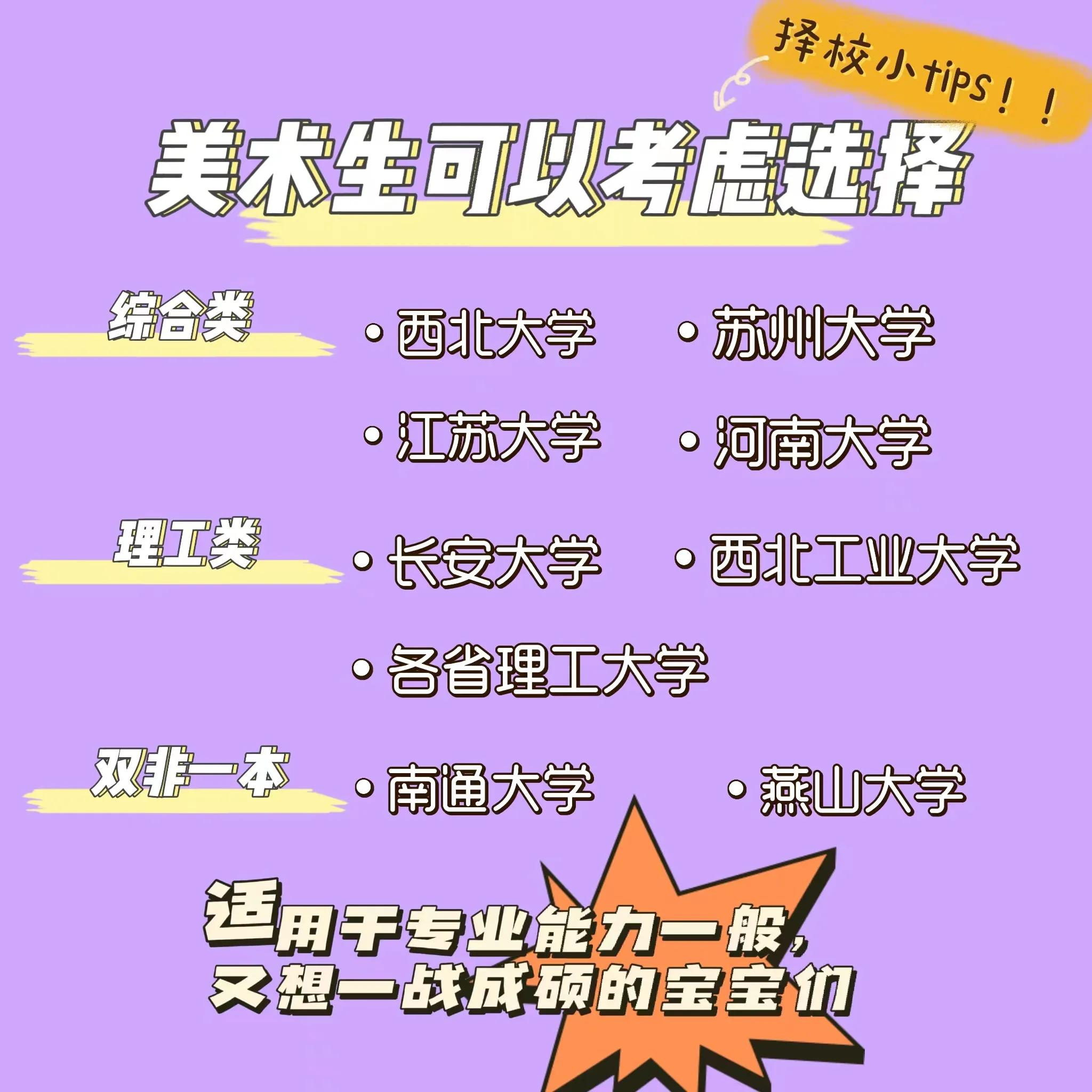 这种方法只针对自学能力一般,想一战成功,考研攻岸的小伙伴。请自行绕行。艺术生可以适当考虑一些综合性大学,比如西北大学、苏州大学、江苏大学、河南大学等。理工科大学,如陕西科技大学、西北工业大学、长安大学、各省理工大学、xi工程大学、燕山大学、南通大学、山西大学、河北大学等