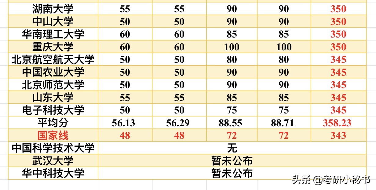 第三组是350分左右的学校,有湖南大学,中山大学,华南理工、重庆大学等。虽然这几所学校分数都是350分,但是重庆大学的单科线要远超其他几所学校,其中政治英语单科线60,专业课单科线100分。尤其是专业课的专科线是非常高的,在34所学校中,也就同济大学,浙江大学和重庆大学三所学校的专业课达到了100分。