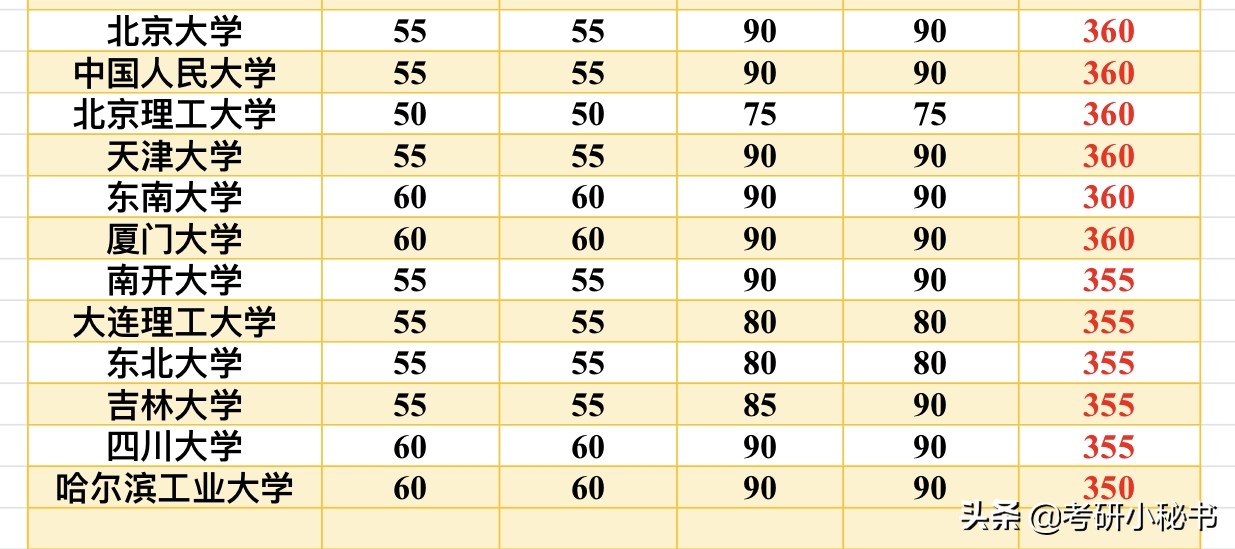 排在第二组的是以北京大学、中国人民大学为代表的360分左右的学校,包括北京理工,南开大学东北大学,哈尔滨工业大学等。作为中国的top2,北京大学的复试线要比清华大学少15分,政治英语的单科线也要低5分。