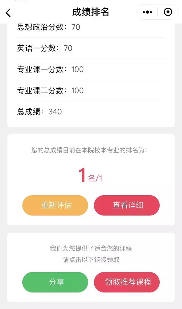 小程序可以为你解决以下问题。它可以根据你所填报的院校和科目的分数,准确评估你的考研成绩在我们校本专业的排名,并呈现直观的数据分析结果,让你做到心中有数,知己知彼。同时,我们有针对性的复试指导课程帮助您顺利通过复试。