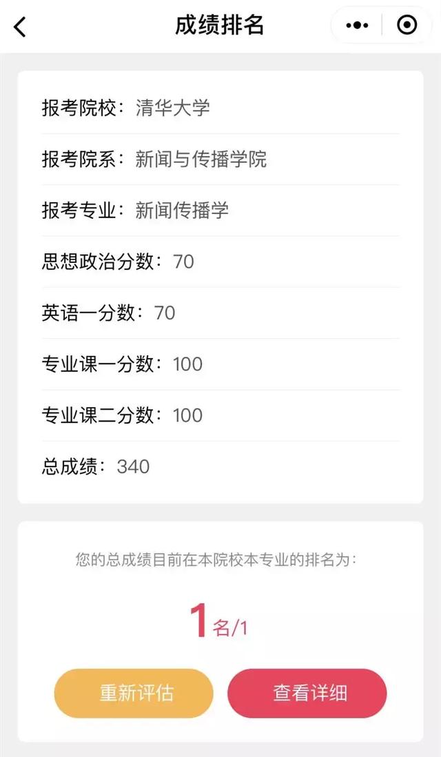 知道成绩排名对我来说是什么,可以让你在众多的人当中初步了解自己的实力,这样即使你的初试成绩排名比较靠后,那么你也可以集中精力进行复试,在面对高校的差额复试的方式时,利用你优秀的复试成绩脱颖而出。最后赢得了高校的青睐。