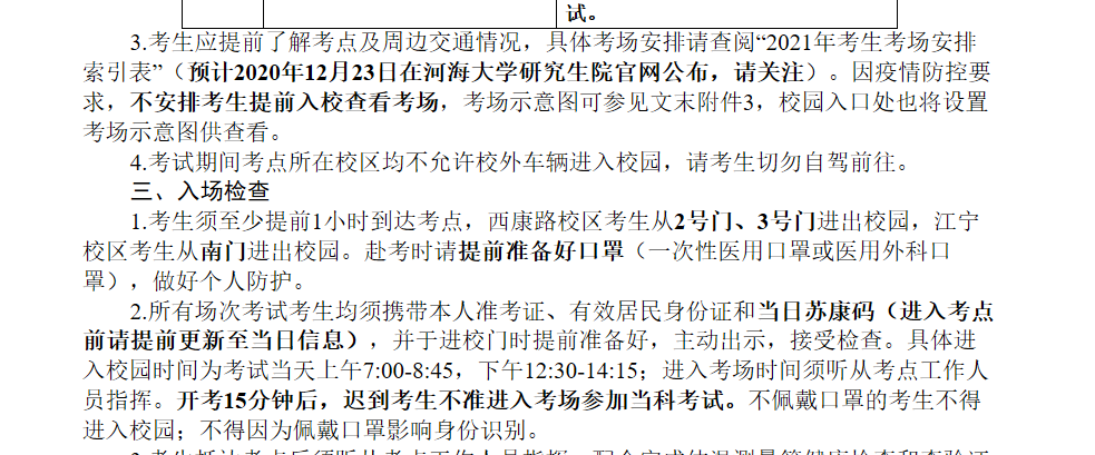 河海大学也发布了相应的通知。因防疫要求,取消考生提前检查考场,公告在准考证上注明对应教学楼。大家必须提前到场检查,最后几天不允许检查考场。