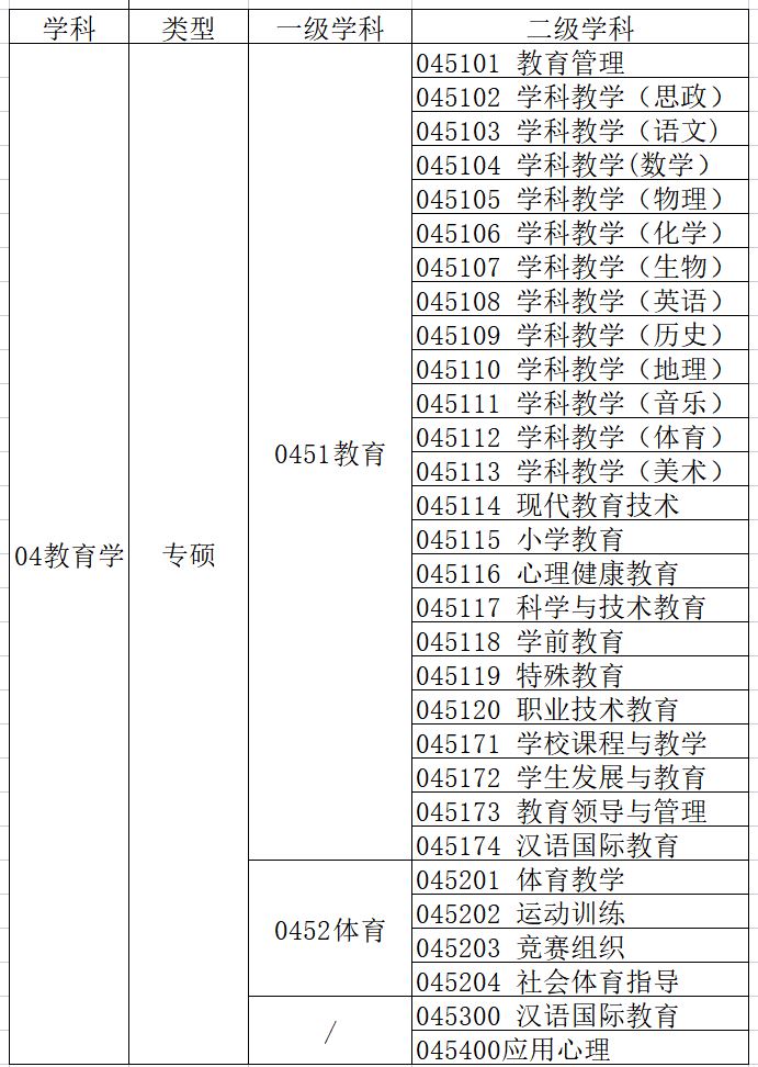 教育学硕士和专业硕士一级学科和两个学科见下表: